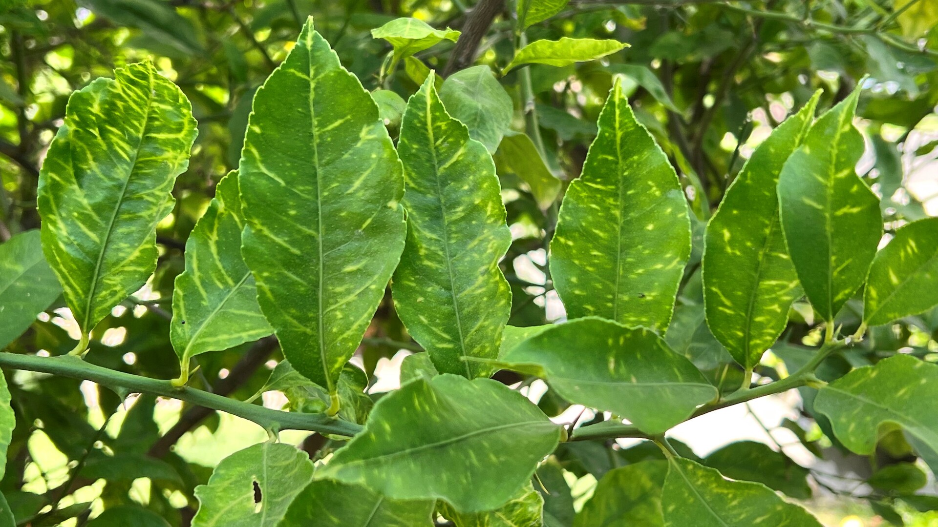 Although less pronounced in the summer, the symptoms of young lemon and sour orange trees appear water-soaked with clear-yellow veins on the front side of wrinkled and warped leaves. While some infected trees present more diverse symptoms, like irregular ringspots on leaves, and mosaic-like patterns on citrus fruits.